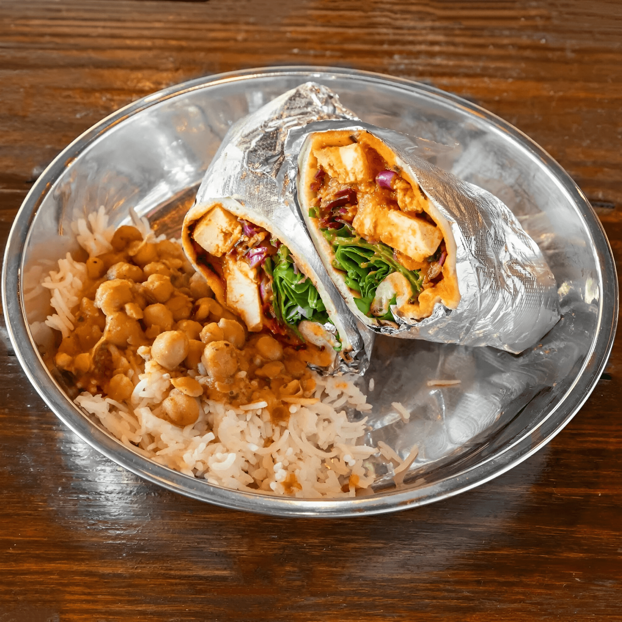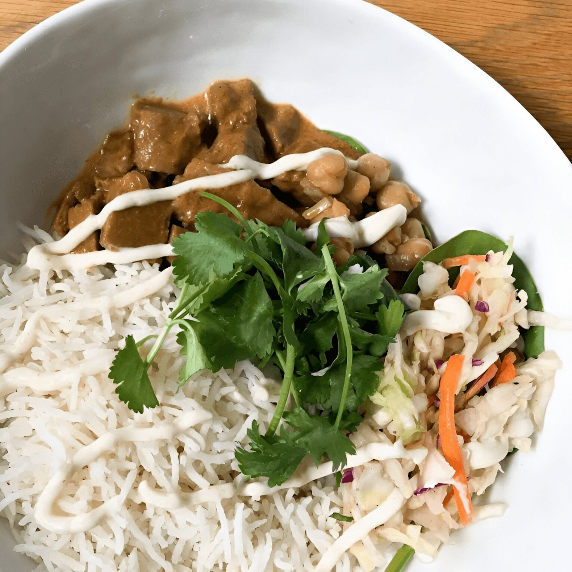 I eat a ton of Indian food, and while this place was pretty different than traditional Indian restaurants, it was really good! Fluffy rice, flavorful deep rich chicken Tikka masala, bright cabbage with acid to give some relief, perfectly tender chickpeas, fresh micro herbs on top, naan bread super fluffy, I'm really impressed.